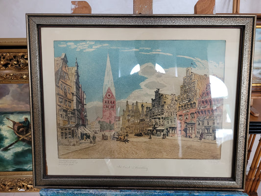 Handsignierte Farblithographie Altstadtweg Stadtansicht Gerahmt
