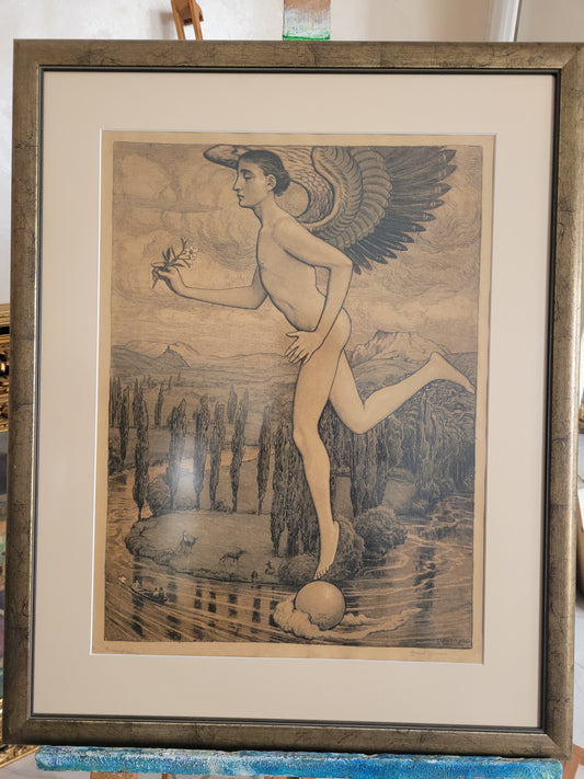 Hans Thoma Radierung Geflügeltes Schneckenfabelwesen mit Putto