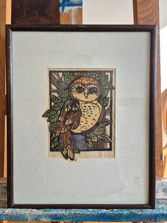 Handsignierte Farbradierung Braune Eule mit Blättern 29,5x36 cm