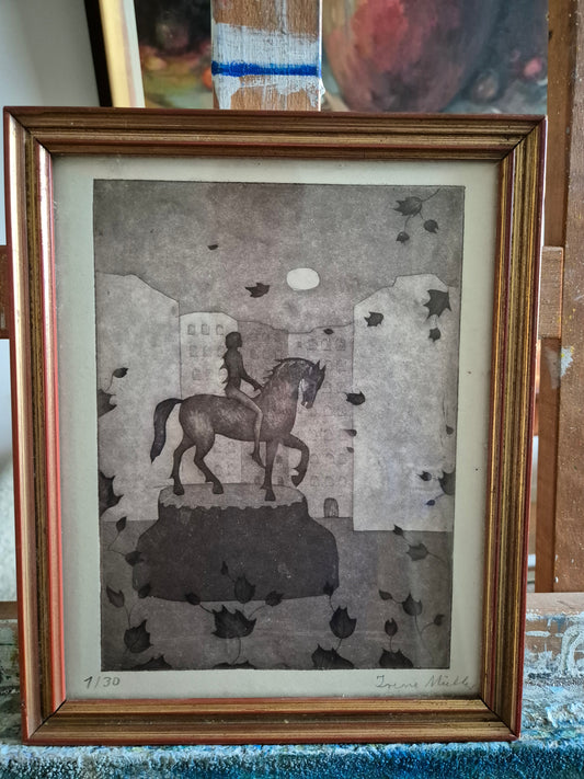 Irene Müller (1941) Original Radierung Pferdestatue bei Vollmond 22,5x27,5