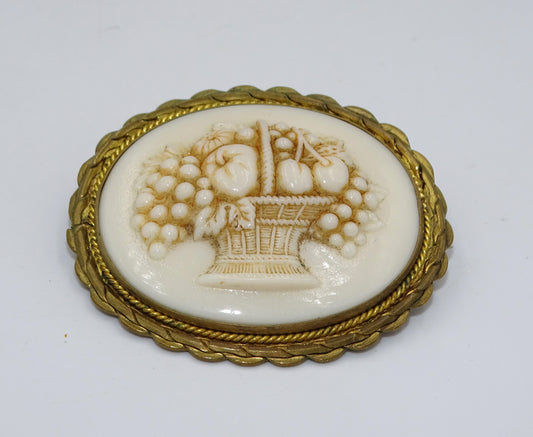 Kamee-Brosche Antik mit Goldener Fassung und Obstkorb-Motiv