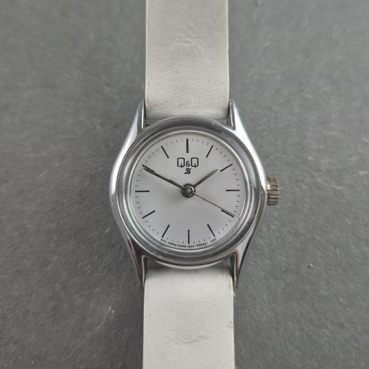 Klassische Q&Q Armbanduhr – Minimalistisches Design mit weißem Lederarmband