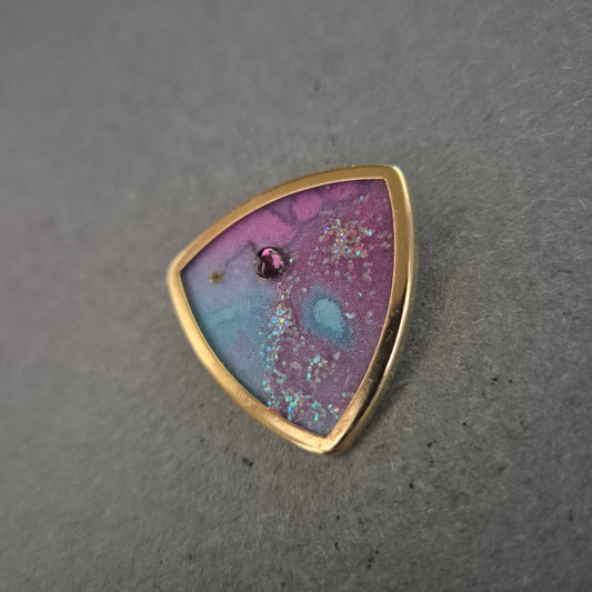Künstlerische Brosche mit Glitzereffekt – Lila-Türkis Design in Goldrahmen
