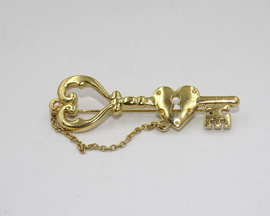 Schlüssel und Herz mit Schlüsselloch Brosche mit Sicherheitskettchen