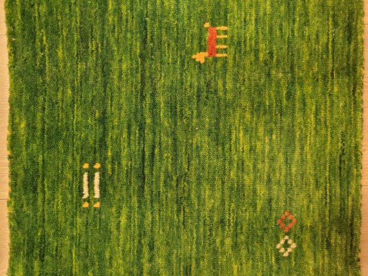 Gabbeh Teppich Wolle grün mit Tiermotiv quadratisch