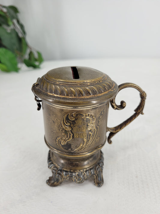 Verzierte Messing Spardose, Büchse mit geschwungen Griff auf Sockel