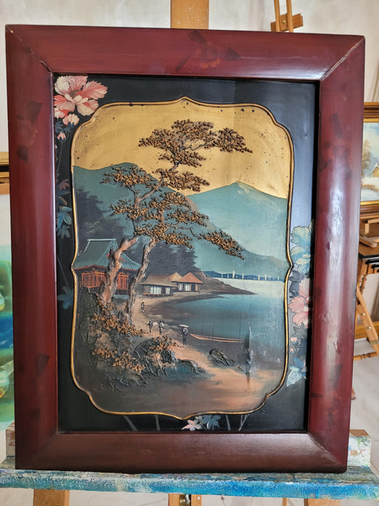 Antike Japanische (XIX-XX) Lackmalerei auf Holz, Idyllisches Dorf am See