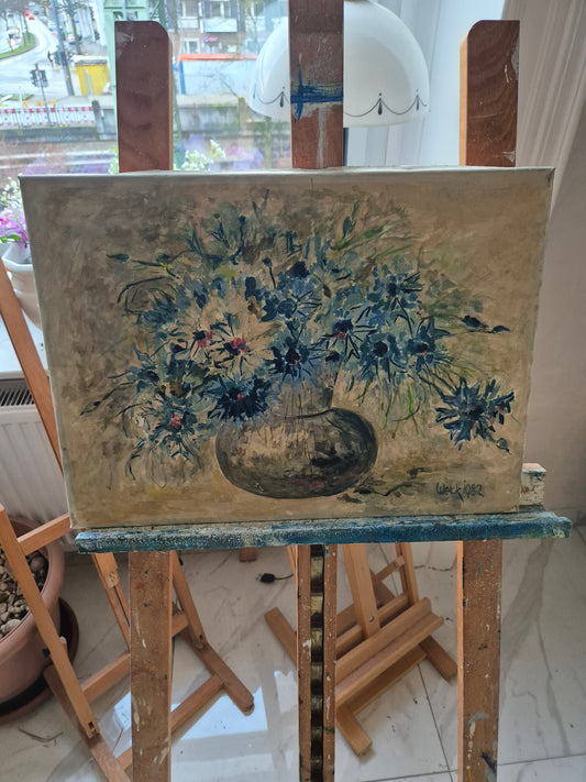 Ölgemälde Handsigniert Blumenstillleben Kornblumen von Welck (1982)