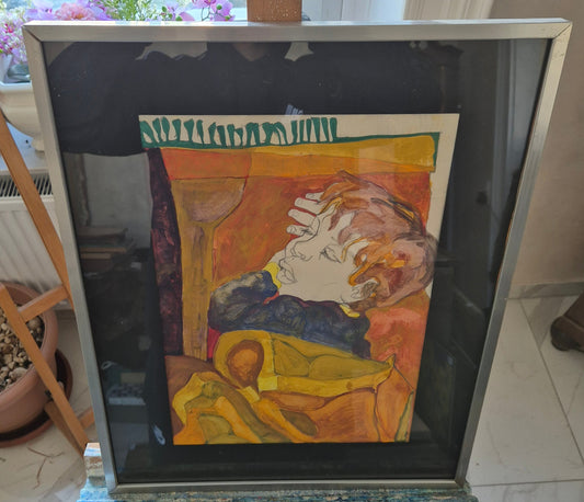 Handsigniertes Aquarell Mischtechnik Erschöpfung Mann 49x59cm