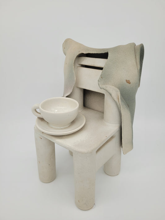 Keramik Figur Skulptur eines Stuhl mit Tasse Signiert und Datiert 1981