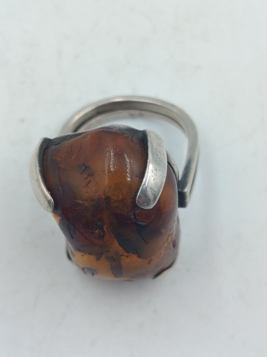 925 Silber Ring mit großem Bernstein Modern Handgefertigt