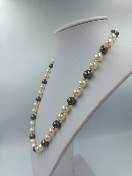Perlenkette Weiß Grau mit goldfarbenen Zwischenelementen