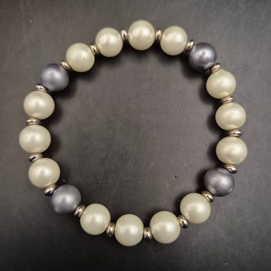 Elastisches Perlenarmband – Creme & Grau mit silberfarbenen Akzenten