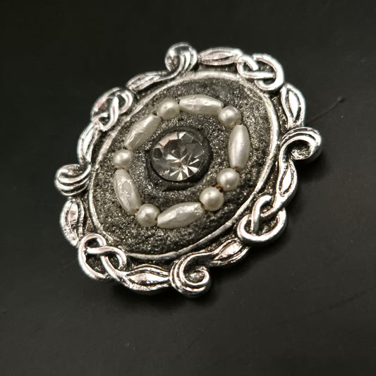 Silberfarbene Vintage Brosche – Strass & Perlen im Ornamentrahmen