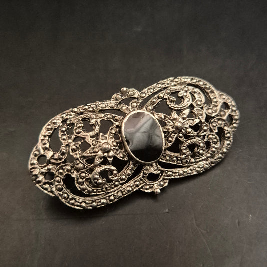 Verschnörkelte Vintage Brosche – Silberoptik mit schwarzem Stein