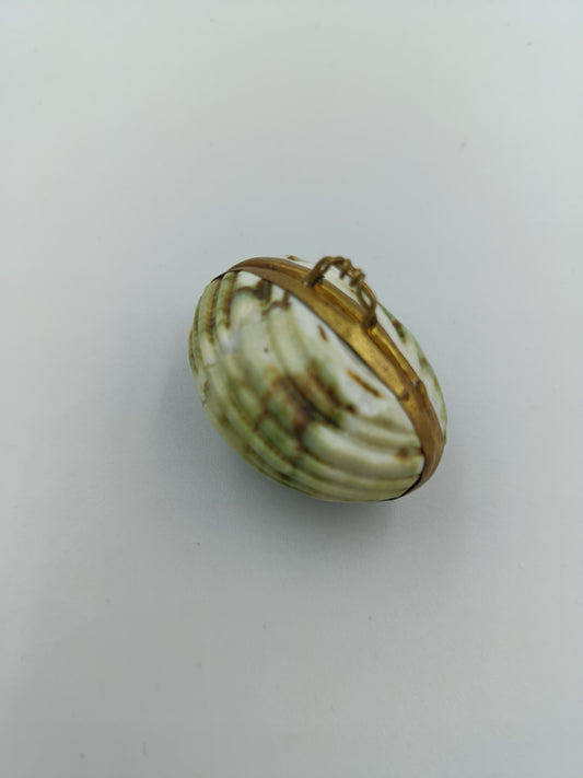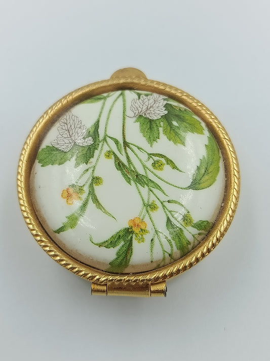 Runde Vintage-Porzellandose mit zarten grünen Blättern