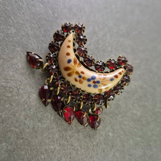 Vintage Brosche mit Keramikmond und roten Steinen