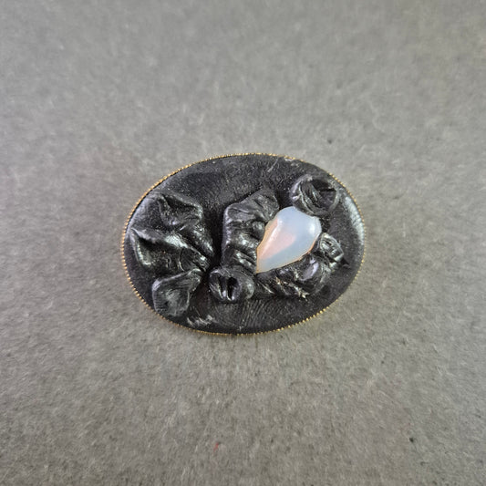 Antike Brosche mit schwarzer Reliefarbeit und Opalglas-Einsatz