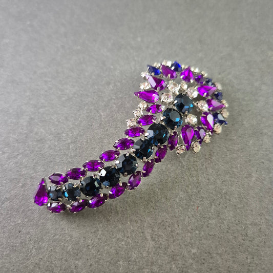 Brosche mit lila und blauen Strasssteinen – Funkelndes Vintage Schmuckstück