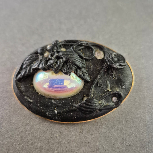 Ovale Brosche im Barock-Stil – Schwarz mit irisierendem Cabochon