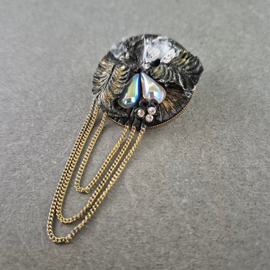 Runde Vintage-Brosche mit Ketten – Dekor mit Perlmutt und Strass