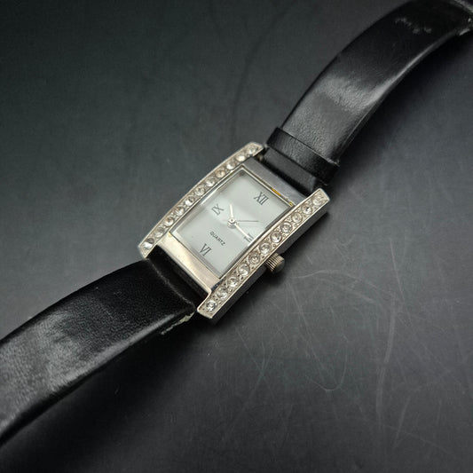 Rechteckige Damen Uhr mit Strassbesatz und schwarzem Armband