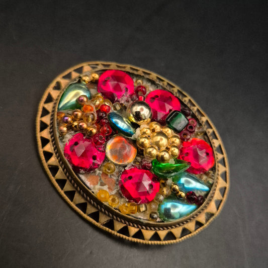 Vintage Brosche mit bunten Glassteinen & Perlen, Blumen-Motiv