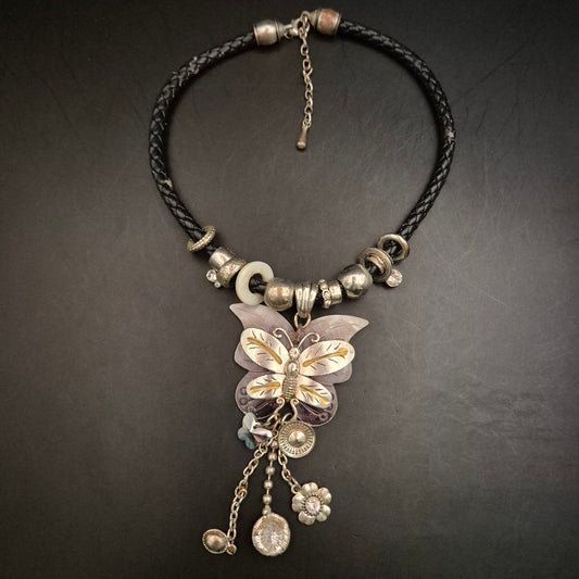 Vintage Halskette Schmetterling mit geflochtenem Lederband FES4814