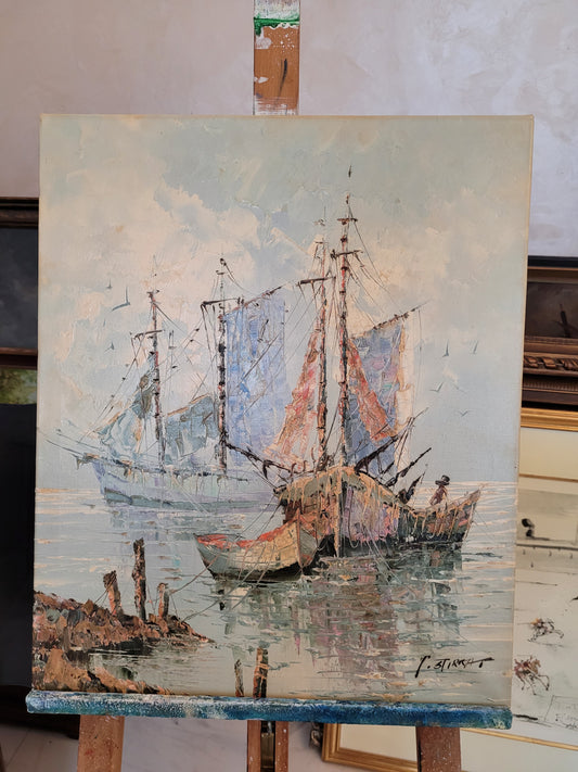 Europäische Schule (XX) Ölgemälde Fischerboote vor Küste 60x50cm
