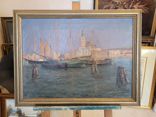 Europäische Schule (XX) Ölgemälde Handsigniert Blick auf Venedig 55x72cm