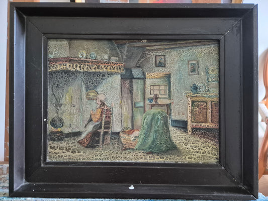 Europäische Schule (XX) Ölgemälde Alte Frau beim Nähen 38x30 cm