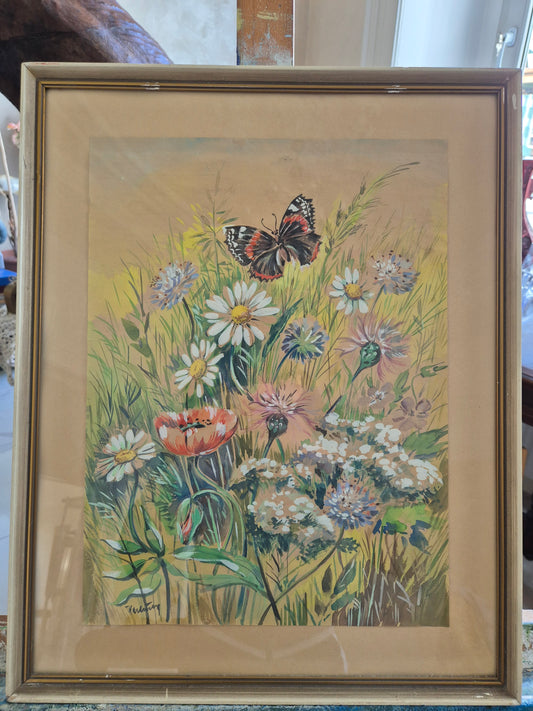 Europäische Malerschule (XX) Mischtechnik Blumen und Schmetterling
