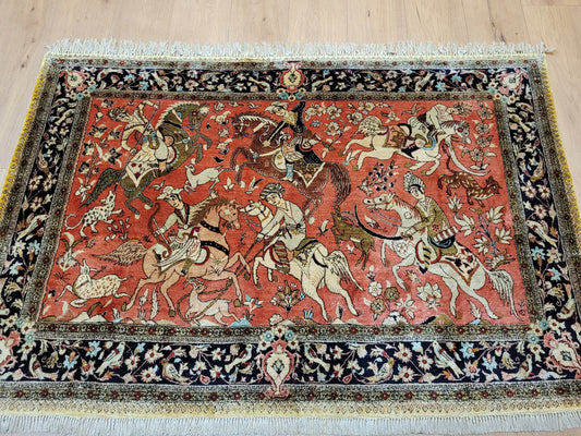 Ghom Teppich Seide auf Seide Jagdszene florales Motiv feine Knüpfung