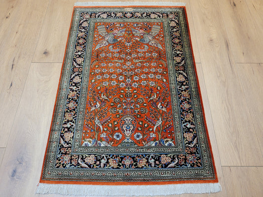 Ghom Teppich Seide auf Seide signiert florales Vogelmotiv feine Knüpfung