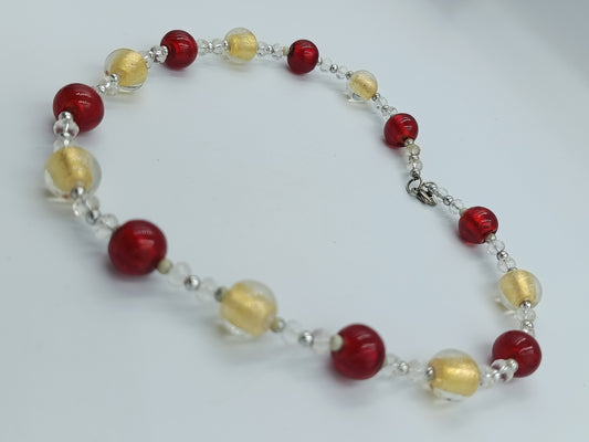 Glasperlenkette in Rot & Gold mit Silberdetails