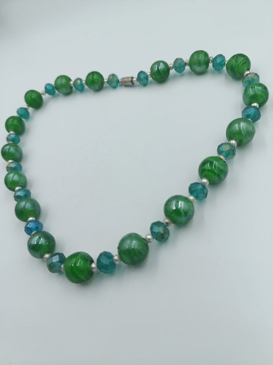 Glasperlenkette in Grün und Blau mit Silberdetails