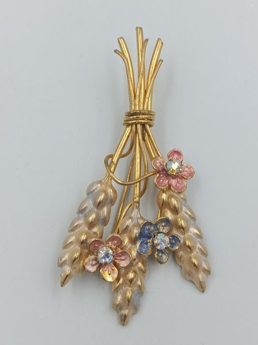 Goldfarbene Ähren-Brosche mit Emailblüten