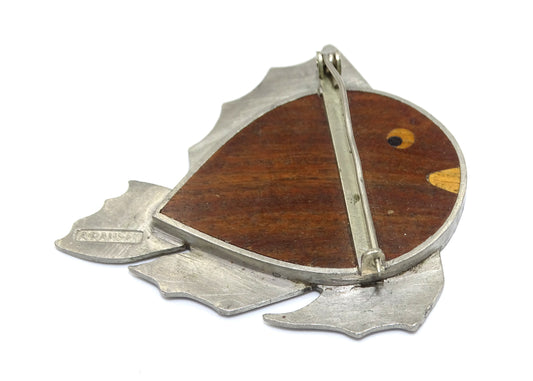 Große Vintage Holz und Metall Brosche in Fisch-Form von Künstlerin A. Ramsay