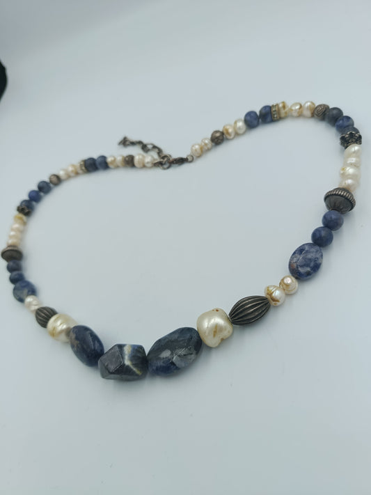 Halskette mit Sodalith-Steinen und Süßwasserperlen