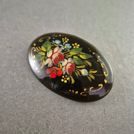 Handbemalte Vintage-Brosche mit floralem Motiv auf schwarzem Grund