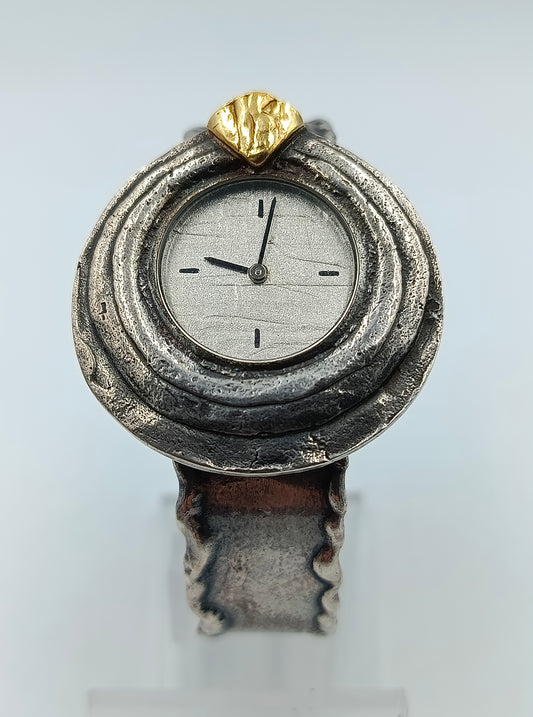 Handgearbeitete 835er Silberuhr mit Gold-Akzent
