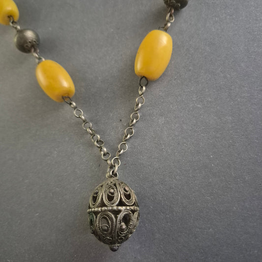 Antike Silberkette mit Bernsteinperlen und filigranem Anhänger