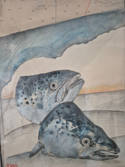 Ole West (XX) Aquarell Malerei Handsigniert Datiert 1998 zwei Fischköpfe