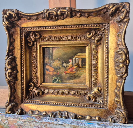 Ölgemälde Hühner Stall Bauernhof Deutsche Schule (XX) 18x19cm