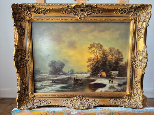 Ölgemälde Handsigniert Winterlandschaft Abendrot Eissee Deutsche Schule