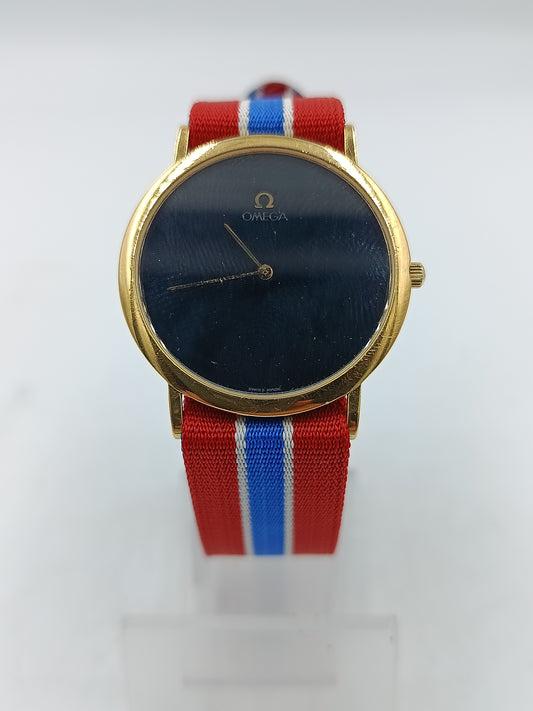 Omega Vintage Herrenuhr mit rundem goldfarbenem Gehäuse und sportlichem Nato Armband