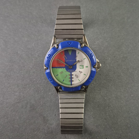 Seltene Qemeux Herrenarmbanduhr – Buntes Design mit Edelstahlarmband