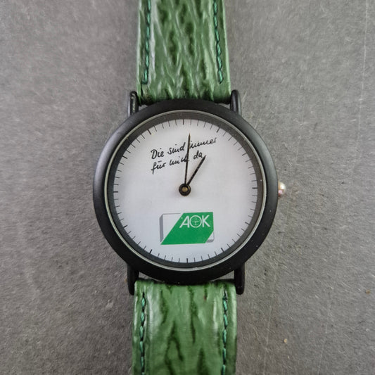 Seltene AOK Quarz Uhr – Werbeuhr mit grünem Lederarmband