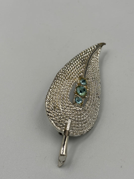 Vintage Blattformige Brosche in Silber mit Hellblauen Steinen