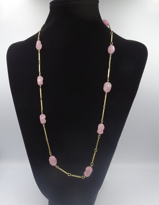 Art Deco Hübsche alte goldfarbene Halskette mit Rosenquarz - Amerik gestempelt